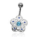 Navelpiercing - sterling zilver 925 bloem met aqua blauw kristal in de kern en donker blauw in de hartjes. Materiaal bloem bedel: Sterling zilver 925 Materiaal staaf: 316L Chirurgisch staal Steensoort: Kristal Verpakt in een bijbehorend sieradendoosje van JYC, gereed om cadeau te geven. Ean: 8720661346744 - ks FBP-04