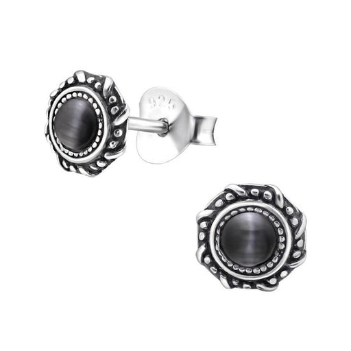 Sterling zilver 925 Bali ronde oorbellen geoxideerd met grijze graphite cat eye. Materiaal : 925 sterling zilver Afwerking : Geoxideerd, E-coat Gro...
