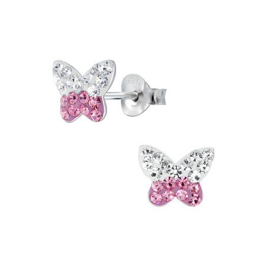 Sterling zilver 925 Vlinder oorbellen met roze en wit kristal Design grootte: 12 mm x 8 mm Bewerking: E-Coat Materiaal: Sterling zilver 925 Steenso...