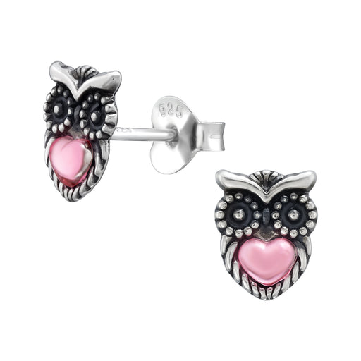 Joy|S - Zilveren uil oorbellen - 6 x 8 mm - met roze hartje - geoxideerd - oorknoppen