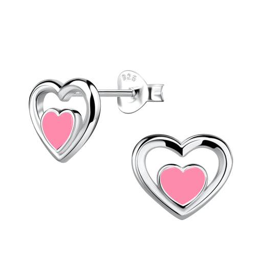 Joy|S - Zilveren hartje oorbellen - 10 x 9 mm - zilver hart met daarin een roze hartje - gepolijst - oorknoppen met vlindersluiting