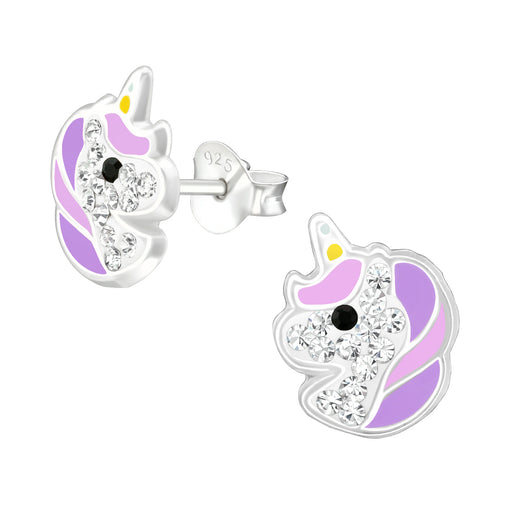 Sterling zilver 925 Eenhoorn oorbellen paars met glitter en kristalletjes. Materiaal: Sterling zilver 925 Afwerking: E-coat Afmeting: 8 mm x 11 mm...