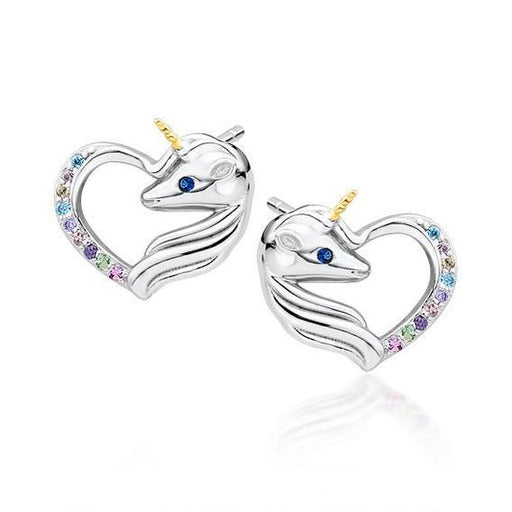 Sterling zilver 925 unicorn oorbellen. Materiaal : 925 sterling zilver Afwerking : E-coat Grootte: 8 mm x 9 mm Aantal stenen: 28 Verpakt in een bi...
