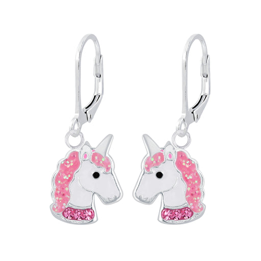 Sterling zilver eenhoorn oorbellen met roze kristal. De oorbellen hebben een chique leverback sluiting, ook om verlies te voorkomen/ beperken. Mate...