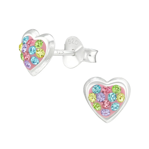 Sterling zilver 925 roze hartje oorbellen met roze, blauw, groen en gele kristalletjes. Afmeting: 6 mm x 6 mm Materiaal: Sterling zilver 925 Afwer...