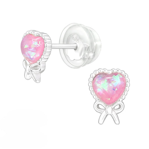 Alle gegevens bekijkenJoy|S - Zilveren hartje oorbellen - roze opaal - met strikje - 5.4 x 7.3 mm - kinderoorbellen met siliconen vlinder sluiting