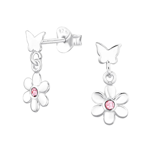Joy|S - Zilveren vlinder met bloem bedel oorbellen - 6.2 x 14 mm - roze kristalletje - kinderoorbellen