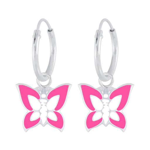 Sterling zilver 925 vlinder bedel oorbellen roze met wit. Design grootte vlinder: 8 mm x 7 mm Diameter oorring: 1.2 cm Bewerking: E-Coat Materiaal:...
