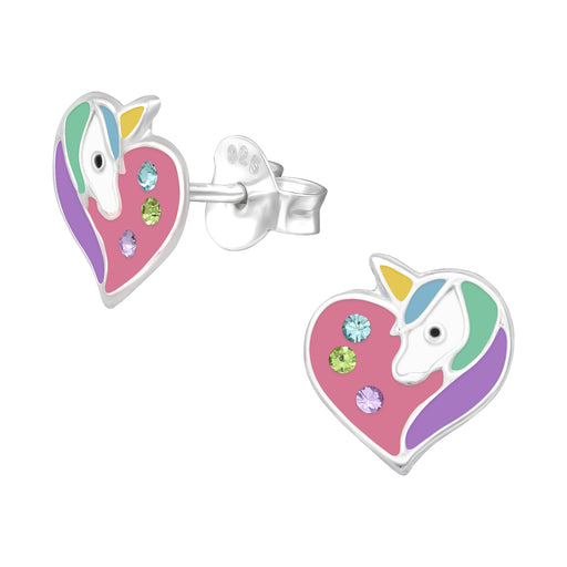 Sterling zilver 925 eenhoorn hartje oorbellen met paars groen en blauw kristalletje.  Afmeting: 8 mm x 9 mm Bewerking: E-Coat Materiaal: Sterling ...