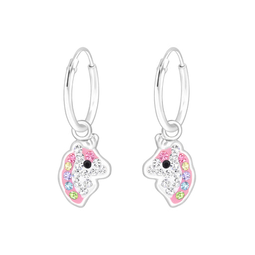 Sterling zilver 925 eenhoorn bedel oorbellen - oorringen met gekleurde kristalletjes. Afmeting eenhoorn bedel: 9 mm x 10 mm Doorsnede oorring: 1.2 ...
