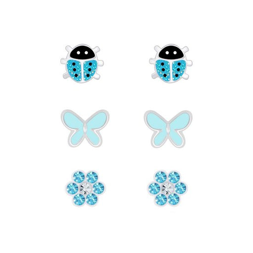 Sterling zilver 925 oorbellen 3 paar: Lieveheersbeestje blauw met glitter, Vlinder blauw, Bloem met blauw kristal. Materiaal : 925 sterling zilve...