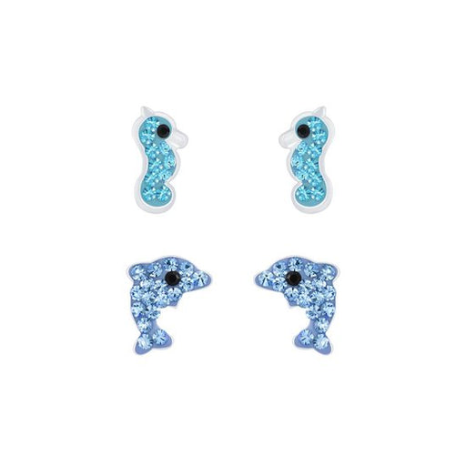 Sterling zilver 925 oorbellen set - 2 paar 1 paar: Dolfijn met blauw kristal - 8 mm x 9 mm 1 paar: Zeepaardje met blauw kristal - 5 mm x 9 mm Mater...