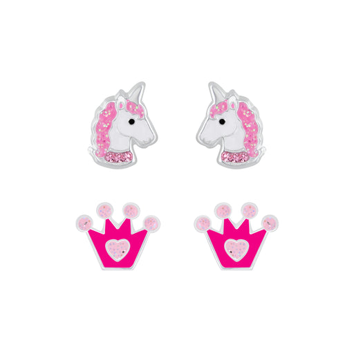 Sterling zilver 925 oorbellen 2 paar: Eenhoorn met kristal, Kroontje met glitter hartje Materiaal : 925 sterling zilver Afwerking : E-coat Afmetin...