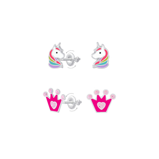 Alle gegevens bekijkenJoy|S - Zilveren oorbellen set 2 paar - kroontje - eenhoorn met screw back sluiting