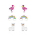 Sterling zilver 925 oorbellen 3 paar: Alpaca, Regenbog met glitter wolkjes, Roze vogel.